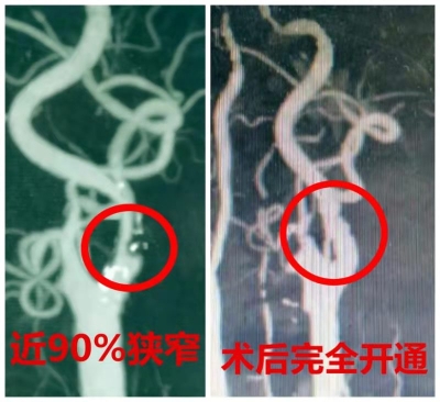 在神經(jīng)外一科醫(yī)護團隊的精心管理及護理下,張大爺術(shù)后第二天即可下地活動,肢體反復癱瘓等癥狀消失,并且左眼視物不清的癥狀消失。復查頸部CTA檢查,左側(cè)頸內(nèi)動脈管徑完全恢復正常,避免了腦卒中發(fā)生的危險。