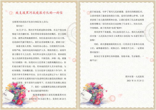 據(jù)介紹,省醫(yī)院支援黑河應急醫(yī)療隊共收治新冠肺炎患者69人,其中重癥1例,最小的患者2歲,最大的患者90歲,在兄弟單位接手前,共治愈出院35人。治療期間,醫(yī)療隊收到了多封患者表揚信,小患者們則用畫筆表達了對天使們的感謝與敬仰,有的未出院患者聽說省醫(yī)院醫(yī)療隊要離開了,都依依不舍,紛紛表達對醫(yī)療隊精湛的醫(yī)技和暖心醫(yī)療的感謝。