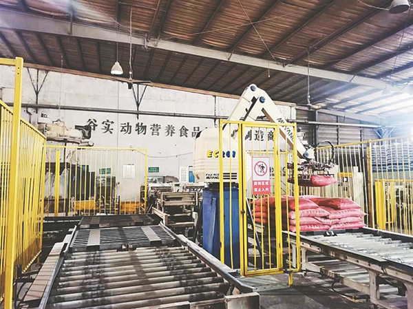 谷實生物集團(tuán)股份有限公司車間里的機器人碼垛設(shè)備。