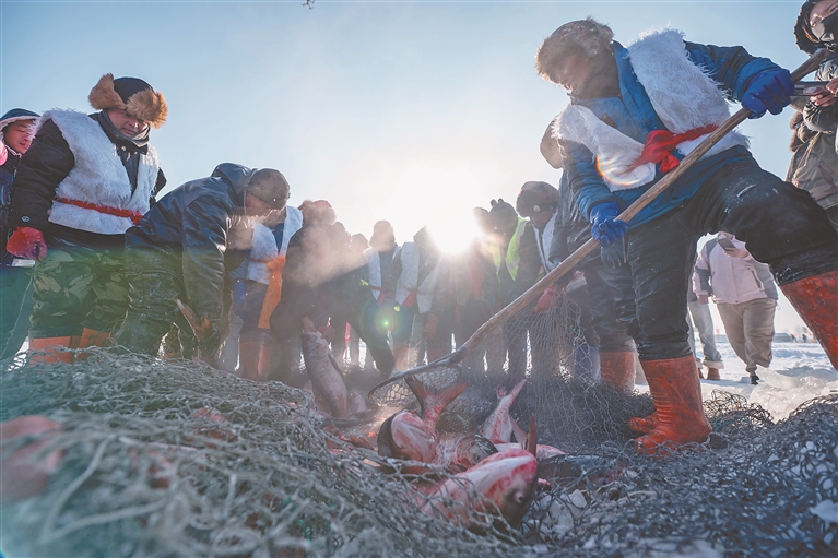 最具儀式感的冬捕祭祀儀式無疑是本次活動的重頭戲之一。在魚把頭的帶領(lǐng)下,漁民們遵循古老傳統(tǒng),祈求庇佑、漁業(yè)豐收,隨著漁民收網(wǎng),網(wǎng)中的大魚逐漸顯露出湖面。