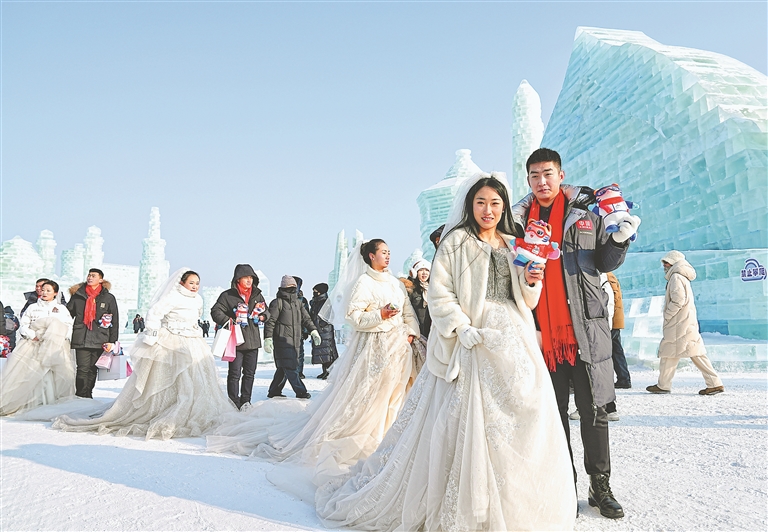 婚典儀式結(jié)束后,新人們乘坐哈爾濱冰雪大世界雪花摩天輪,俯瞰壯美的北國風(fēng)光,和游人一起賞冰玩雪、拍照留念。在太陽島雪博會(huì),新人們欣賞雪雕藝術(shù)之美,在憨態(tài)可掬的《雪人先生》、氣勢磅礴的主塑《雪艷春》等雪雕前拍照留念,體驗(yàn)“走著走著就一起白頭”的人工降雪浪漫場景,在潔白冰雪筑起的美輪美奐童話世界中,感受哈爾濱冰雪文化的浪漫氛圍。