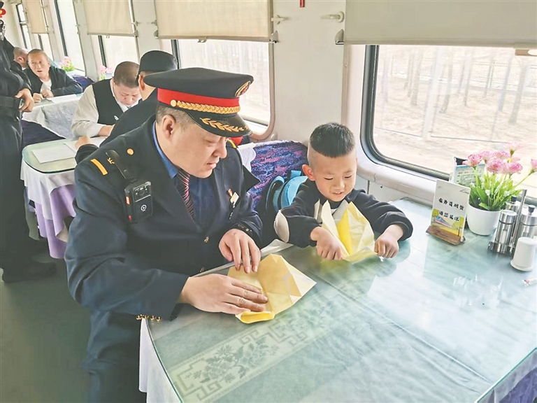 本報(bào)訊(張蔚萌 王夢(mèng) 記者 王迪)近日,由鄭州開往海拉爾的K927次列車從昌圖站駛出后,列車長(zhǎng)孫志強(qiáng)接到12306轉(zhuǎn)發(fā)的緊急尋人求助工單。經(jīng)過(guò)與客服溝通了解后得知,旅客劉玲玲帶6歲兒子劉俊澤從沈陽(yáng)北站乘車至昌圖站,因下車時(shí)忙于整理行李,將座位上熟睡的孩子遺落在列車上。列車長(zhǎng)孫志強(qiáng)通過(guò)對(duì)講機(jī)立即組織各節(jié)車廂列車員尋找孩子,確定孩子位置后迅速趕到現(xiàn)場(chǎng)。為了緩解孩子的緊張情緒,他化身“臨時(shí)爸爸”,將孩子帶到了餐車,不僅準(zhǔn)備了一些自帶的小零食,還陪孩子一起折紙飛機(jī)。當(dāng)列車停靠長(zhǎng)春站后,孫志強(qiáng)按照其母親劉玲玲的要求,將孩子安全移交給長(zhǎng)春站工作人員,等待其家屬前來(lái)接領(lǐng)。