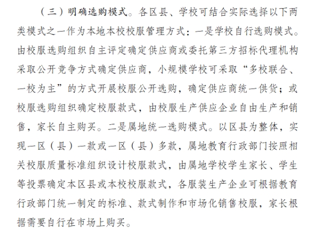 新規(guī)設計的“自行選購模式”靈活且務實:規(guī)模較大的學??勺灾髟u定供應商或委托第三方招標;小規(guī)模學??刹扇 岸嘈B?lián)合、一校為主”的方式降低采購成本;甚至允許“確定款式后,由企業(yè)市場化生產(chǎn)銷售,家長自主購買”。新規(guī)嚴禁“定點”“定商標”干涉交易,不得設置不合理入圍條件,確保所有合規(guī)企業(yè)都能公平參與競爭。
