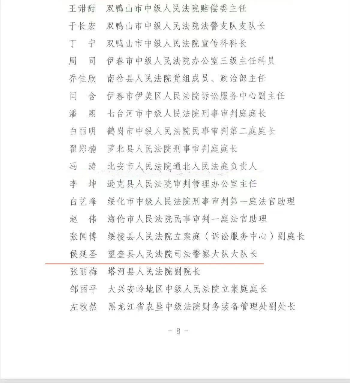 黑龍江經(jīng)濟網(wǎng)訊(董慧瑩 徐金玲 記者馬朝林)近日,黑龍江省高級人民法院印發(fā)《關(guān)于表彰全省法院先進集體、先進個人暨全省優(yōu)秀法院、優(yōu)秀法庭和優(yōu)秀法官的決定》,對全省法院系統(tǒng)內(nèi)表現(xiàn)卓越、貢獻突出的集體與個人予以隆重表彰。在此次表彰中,望奎縣人民法院法警隊隊長侯延圣憑借其過硬的政治素質(zhì)、精湛的業(yè)務(wù)能力和突出的工作業(yè)績,光榮獲評“全省法院先進個人”稱號。