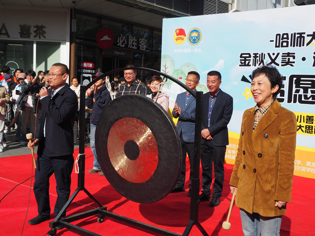 受贈方香坊區(qū)幸福鎮(zhèn)哈藥希望小學校長劉壯現場介紹了這所希望小學留守兒童的情況。開幕式最后,黃磊理事長和張靜萍書記一同敲響大鑼,鳴鑼開市。